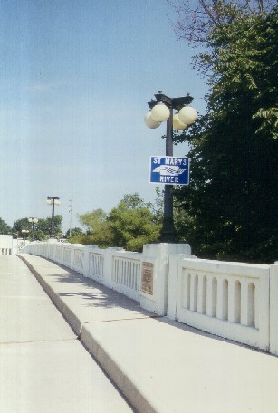 Disappointingly, the 1928 route through Fort Wayne does not cross over the Harrison Street Bridge, an attractive structure that was originally built in 1915 and splendidly rebuilt in 1987. This bridge over the St. Marys River was on the original route of the Lincoln Highway through the city, and features a granite block indicating mileage to New York and San Francisco (NY 724 SF 2660), plus a new builder's plate. Although the classic arch substructure pictured in the early Lincoln Highway Road Guides has been altered by the constuction of plain modern piers, it is nonetheless worth a diversion from the 1928 route to see the restored superstructure. Fans of roadside architecture will also want to watch for Cindy's Diner, a popular downtown eatery just two blocks north of Washington Boulevard, at the northwest corner of Harrison and Wayne Streets. Beyond the bridge, the 1915 route turns west for two blocks at Putnam Street, and then follows Wells Street and State Boulevard north and west to Goshen Road, where it meets the 1928 route.