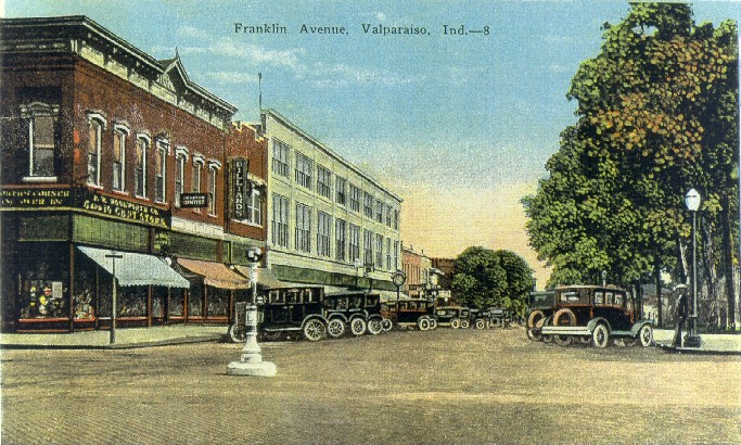 Between 1913 and 1928, the original Lincoln Highway route had come into Valparaiso by way of South Bend, LaPorte, and Westville, much of which is now U.S. 20 and State Route 2. Based on my best reckonings, the route revision of 1928 shortened the route by a significant 22 miles (odd coincidence, and a convenient way to remember it: 20 plus 2 equals 22). As late as 1924, the route followed LaPorte Avenue into Valparaiso before jogging north at Garfield Avenue to meet the present route. Thus, it appears that at some time during the mid-1920s, the street that is now Lincolnway was extended easterly from the half-block jog at Garfield Avenue.