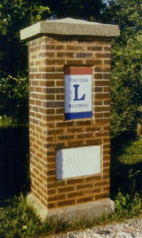 The replica pillar at Oceola—erected in July 2001—is dedicated to Frank A. Seiberling, who was the first of three Ohioans to be elected as president of the Lincoln Highway Association. Past-president Esther Oyster Queneau (Ashland) and current president Bob Lichty (Canton) have both more recently followed in Seiberling’s distant footsteps. This is not the first brick pillar in Ohio to be dedicated to Seiberling. Previously, a pillar had been dedicated in 1918 along what is now State Route 19 between Bucyrus and Galion, at a place locally known as Holmes Curve. The fate of that original pillar is unknown. back