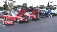Three red mustangs owned by Cloyd and Mary Ann McNaull, the little one being a Fisher-Price Power Wheels Mustang; the next car is a 1913 Stevens Duryea, then comes a 1928 Buick and a 1959 Ford, all owned by Richard and Mary Lou Taylor |