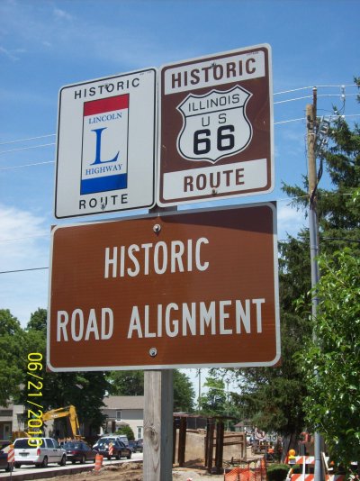 Rare sign assembly in Plainfield, Illinois, where Lincoln Highway and Route 66 overlap for three blocks.