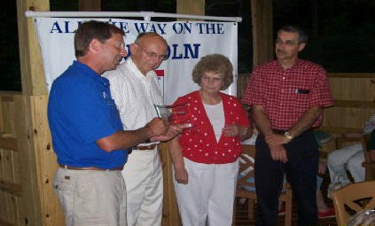 A second “glass award” earned by deserving Ohioans was the “Exemplary Friend Award.” Officially, this award was given to the “State of Ohio Lincoln Highway Chapters” in recognition for their ongoing construction, restoration, and maintenance of the several new and old Lincoln Highway landmarks in Ohio. A typical restoration project was undertaken last summer, when work was performed by the Mid-Ohio Chapter at the original brick pillar east of Oceola (see full story in Buckeye Ramblings #61). With this and other similar projects in mind, the Ohio leadership agreed that it was proper for the Mid-Ohio Chapter to take possession of this particular award, and were thus presented the glass trophy at their monthly meeting on July 15 at the Oak Park Tavern near Mifflin (see below).