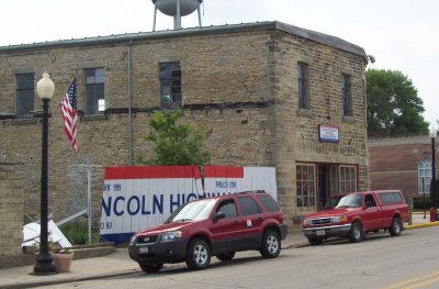 Lincoln Highway banner in Hanna, Indiana, promoting the Hoosier State as the Boyhood Home of Abe Lincoln. |