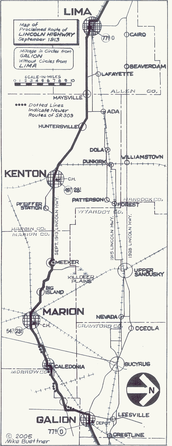 At 13.1 miles, where State Route 235 drops south from Ada to join with State Route 309, the originally proclaimed route of the Lincoln Highway finally meets its first successor route. However, this successor route was like its predecessor in being short lived—in fact, the route was changed so frequently between 1913 and 1919 that this author has yet to find two guide books that describe the same path between Ada and Lima. However, there was enough reliable evidence from a December 1913 Lima newspaper article for this author to chart the first successor route in his road guide project.