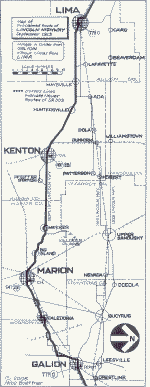 However, at the end of that same month, Henry Joy made a significant revision. For whatever reason, sixty miles of the market route were abandoned in favor of a path which was supposedly shorter, bearing westerly from Galion to Bucyrus before continuing on to Upper Sandusky and Lima. Actually, Joy had made the path to Lima longer by three miles, with a series of tedious right angle turns and dangerous railroad grade crossings being the rule, and not the exception, west of Bucyrus. This author remains steadfast in his belief that politics—not mileage—provided the impetus for the sudden change. These matters, which included key players such as Lincoln Highway Consul John Hopley (from Bucyrus) and Governor Frank Willis (from Ada), are discussed in detail in a Spring 1997 article in The Lincoln Highway Forum, entitled "Before the Route Was Straight: Ohio's Zigzag Route."