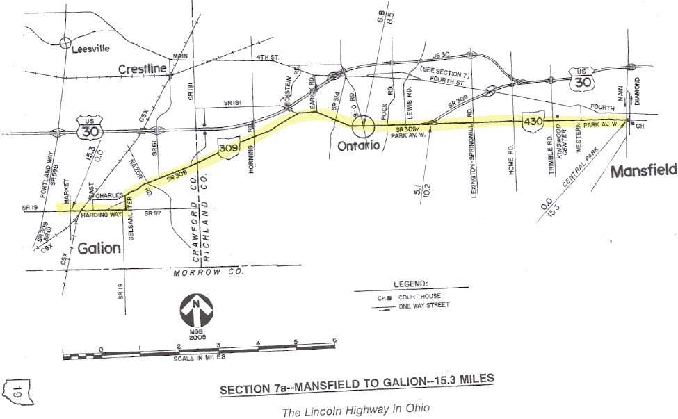 SECTION 7a—MANSFIELD TO GALION—15.3 MILES Between 1913 and 1920, the route of the Lincoln Highway was from Mansfield to Galion, following most but not all of today's State Route 309. Both cities were on the route of Main Market Route No. 3, which connected nine county seats as it crossed Ohio. Although not a county seat, Galion was then a city of about 8200, and became an important junction point for both highways and railways. At Galion, the coast-to-coast tourist of the 1910s had a choice of two different routes to proceed west. Of course, one choice was the Lincoln Highway. The second choice was the Marion Way, which eventually became the Harding Highway. The Marion Way included that same portion of the market route between Galion and Lima which had been so quickly removed from the originally proclaimed Lincoln Highway route in 1913, a story which is more completely told in Section 10a. The spirited efforts of citizens in Marion and Kenton to get back on the Lincoln Highway began a rivalry between northern route and southern route cities that essentially continued until 1973. It was in that year that the state finally did away with the 30-N and 30-S designations, assigning the current U.S. Route 30 and State Route 309 numbering that exists today. The old combination of numbers and letters were created in May 1931, when State Route 5 between Mansfield and Delphos had been improved enough to merit a federal designation. The northern route of State Route 5 thus became U.S. 30-N, and the southern route, which in 1926 had ironically become the original route of U.S. 30, became U.S. 30-S. At a time when federal aid was much coveted for the improvement of major highways, everyone on the two routes would benefit from this dual designation. By the time the northern route did assume the present designation of U.S. 30, many sections of old 30-N had become four-lane limited access highways. This was especially true west of Beaverdam, but bypasses were also in place at Bucyrus and Mansfield. Leaving downtown Mansfield via today's State Route 430, the early route of the Lincoln Highway meets State Route 309 within the town limits of Ontario. Route 309 continues westerly through the center of the original community, then turns southwesterly toward Galion. The old town center of Ontario is certainly a quiet contrast to the suburban sprawl annexed with the automotive plant and shopping center along Fourth Street. At the east side of Galion, the earliest routes did not follow what is now State Route 309. Instead, a diversion is necessary at Gelsanliter Road to stay with those first routes, meeting Galion's Harding Way about one-half mile east of its present junction. Harding Way was originally Main Street in Galion, and was known as Lincoln Way during those years when the historic transcontinental route passed through town. Post cards from this era often feature the same street scene, but with different highway names. Galion is one of only three locations in Ohio (or anywhere in the U.S.?) where variations of the Harding Way name are in legal use for a city street or a rural roadway. In both Marion County (Marion) and Allen County (Lima), portions of State Route 309 are officially designated Harding Highway. Galion appears to be the only place with a Harding Way. In 1931, a brochure was published which described a Harding Highway route from Pittsburgh to Denver, and it would be interesting to find out if there are any other streets on the route that adopted the Harding Highway or Harding Way name. Today, Galion remains an important junction point for two former Big Four/New York Central Railroad properties that are now part of the CSX system. The classic old station downtown is a lasting reminder of the city's proud railroad heritage. Look for the "C.C.C.&St.L." lettering above the doorway of the station, the abbreviation of the Big Four cities—Cleveland, Cincinnati, Chicago, and St. Louis. |