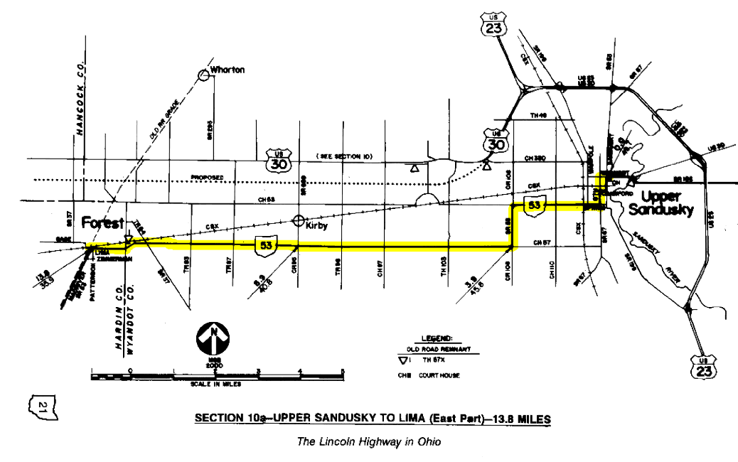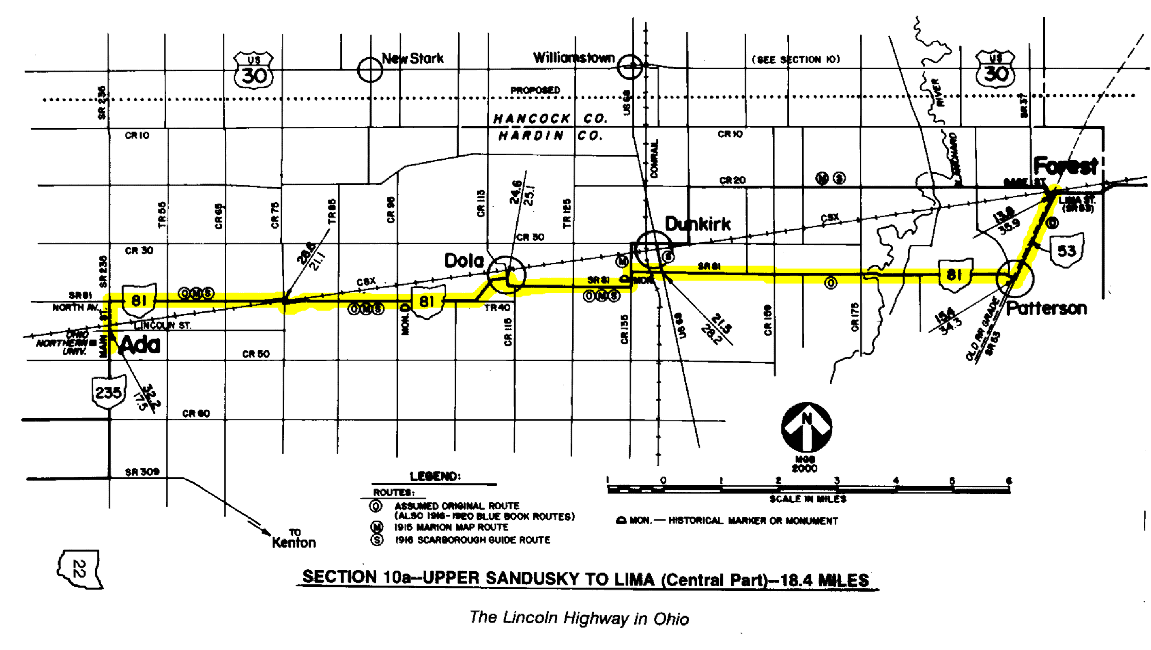SECTION 10a—UPPER SANDUSKY TO LIMA—49.7 MILES Between 1913 and 1919, the Lincoln Highway followed several versions of a "zigzag" route between Galion and Lima, including this section between Upper Sandusky and Lima. There was probably no part of the early route in Ohio that was more maligned than this annoying sequence of right angle turns and railroad crossings. Given that, and considering some of the other negatives of this baffling path, perhaps the criticism was justified. The zigzag route was the end result of Henry Joy's early decision to move the Lincoln Highway north of Marion and Kenton, through a more perfect east-west corridor. Although the two county seats were on the route of Main Market Route No. 3, the most improved roadway through the area, they were a good bit south of a true line west of Mansfield. This prompted Joy to move the route to the next best set of roads to the north, which at that time was the zigzag route. Joy would have preferred to reroute the Lincoln Highway on the "straight" route through Williamstown and Beaverdam, but that road was destined to "languish in the mud" without complete improvements until the late 1920s. Incredibly, the straight route would have had only two right angle turns (at Upper Sandusky) between Bucyrus and Delphos, a distance of 73 miles. By comparison, the zigzag route included at least 32 such turns, plus 12 railroad crossings, according to a map prepared in 1915 by a Marion contingent that tried desperately to return their city to a place on the coast-to-coast route. Moreover, the zigzag route proved to be the longest of the three possible routes, despite the fact that the main reason for Joy's change was to create "the shortest, most direct, and practicable route consistent with the topography." According to the Marion map, the "southern" route was 77.8 miles long, or 3.0 miles shorter than the 1915 version of the zigzag route (there would later be other versions). Not being one to blindly accept any numbers that can still be checked, this author came up with very similar numbers by scaling distances on USGS maps, arriving at 78.1 miles and 81.2 miles, respectively. The number of railroad crossings was somewhat harder to check, because it is impossible to know how a railroad crossing was defined on the Marion map—was each track counted, or each property; and how were crossings counted where two properties ran side-by-side or shared a right-of-way? A telegram to Joy dated March 1, 1916, from interests in Bucyrus claimed that the southern route actually had 17 crossings, a number which I can in no way justify unless multiple tracks within a property were all counted. By this author's count, the number of railroad crossings described on the Marion map seems relatively legitimate. The southern route shows seven railroad crossings as opposed to twelve on the zigzag route. Incredibly, the zigzag route crossed the Pennsylvania Railroad six times between Galion and Lima—east of Nevada; at Upper Sandusky; at Forest; at Dunkirk; west of Dola; and at Ada. The north- south orientation of the Lincoln Highway in these locations was the major contributing factor to the longer distance of the zigzag route. Of the 81.2 miles of roadway that were measured for this study, 10.3 miles actually run in a north-south direction. Recognizing the poor state of the "straight" route through Williamstown and Beaverdam, and the inherent flaws of the zigzag route, Joy's decision may seem questionable. The perturbed citizens of Marion and Kenton appeared to have a good argument to restore the route to its original location as described in the September proclamation. At one point in December 1915, the Marion citizenry sent a delegation to Detroit to meet with Joy, among them being then-Senator Warren Gamaliel Harding. To his credit, Harding served more as a mediator than as a spokesman for his hometown's cause. In a letter to Frank Seiberling (then a director, later a president of the Lincoln Highway Association), Joy wrote "I almost hope Senator Harding will be the next President of the United States, it is so unusual to find a man of that type in public office." Almost prophetically, on November 2, 1920, Harding was elected as the 29th president of the United States. In February 1916, the Marion delegation went to Akron to discuss the situation with Seiberling. Through correspondence with the Detroit office, it is obvious that Joy was firmly entrenched in his position to uphold the route change, much like a similar situation in 1914 where President Woodrow Wilson requested that the Lincoln Highway be routed through Washington, D.C. One particular letter from Secretary Bement to Director Seiberling, dated February 25, 1916, best explains why the questionable zigzag route was chosen—to serve as a temporary route while the association waited [and waited, and waited] for the desired straight route to be sufficiently improved. It had been this author's theory that the purging of the Marion route in 1913 was mainly a result of politics. It seemed here that John Hopley could have been such an important player in the Good Roads movement of the day that he could have swung a route change from Marion to his home town of Bucyrus. Furthermore, the village of Ada, to quote a description in the early Road Guides, was "the home town of his Excellency, the Governor of Ohio [Frank B. Willis], whose residence faces the Lincoln Highway." Willis probably wielded as much (if not more) influence as Hopley, and he certainly captured the spotlight in June 1915 when he gave an inspired Good Roads speech to a large crowd gathered on the college campus in Ada, at the coming of the Lincoln Highway movie caravan. Possible scenarios such as these remind us of Carl Fisher's statement that "the highways of America are built chiefly of politics, whereas the proper material is crushed rock or concrete." By 1916, the Marion Chamber of Commerce was irritated enough to place a large adv