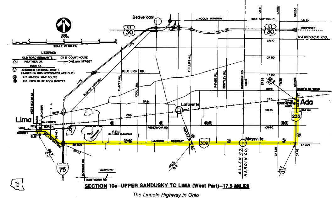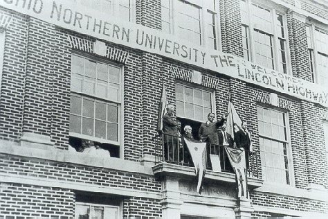 a blossoming When a movie caravan made a promotional tour of the Lincoln Highway on its way to the 1915 Panama-Pacific Exposition in San Francisco, stops were made at several Ohio towns. In Ada, Governor Frank B. Willis gave an inspired "Good Roads" speech at Ohio Northern University. The first variation from the 1913 route appears to have occurred soon thereafter. The Marion map, Blue Book, and Scarborough Guide all show a route that continues south from Ada for only 1.5 miles, turning west at the cemeteries with what is now (Hardin) County Road 60, which becomes Reservoir Road in Allen County. This variation rejoins the assumed 1913 route by turning south onto Napoleon Road, meeting the Harding Highway at a point two miles "below" Lafayette.