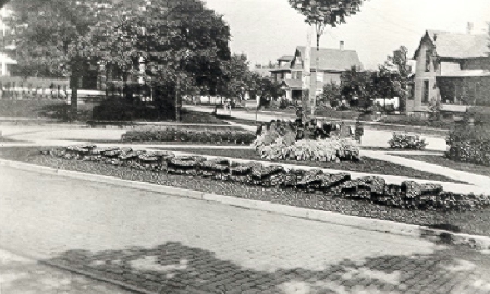 Way through Bucyrus, a long flower bed has been planted, and the words "LINCOLN
